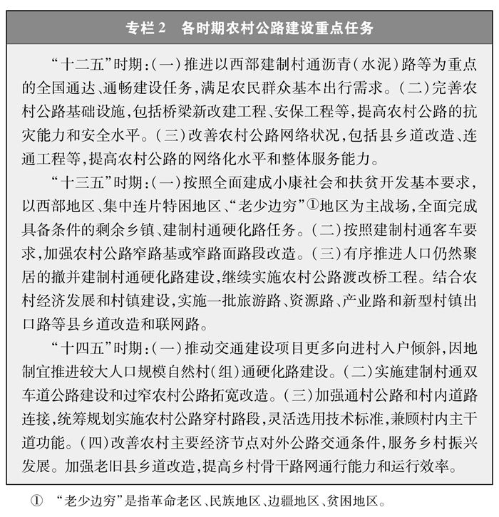 有序推進農(nóng)村公路建設(shè)。在中長期規(guī)劃指引下,制定了公路五年發(fā)展規(guī)劃等階段性規(guī)劃。合理確定不同時期的農(nóng)村公路發(fā)展目標(biāo)和重點任務(wù)(專欄2),有序?qū)嵤巴ㄟ_(dá)通暢工程”、提檔升級工程、安全能力提升工程、聯(lián)網(wǎng)路建設(shè)工程等。因地制宜、分區(qū)分類施策,統(tǒng)籌推進農(nóng)村公路建設(shè),一步一步推進、積小勝為大勝,逐步提升農(nóng)村公路服務(wù)能力和水平。