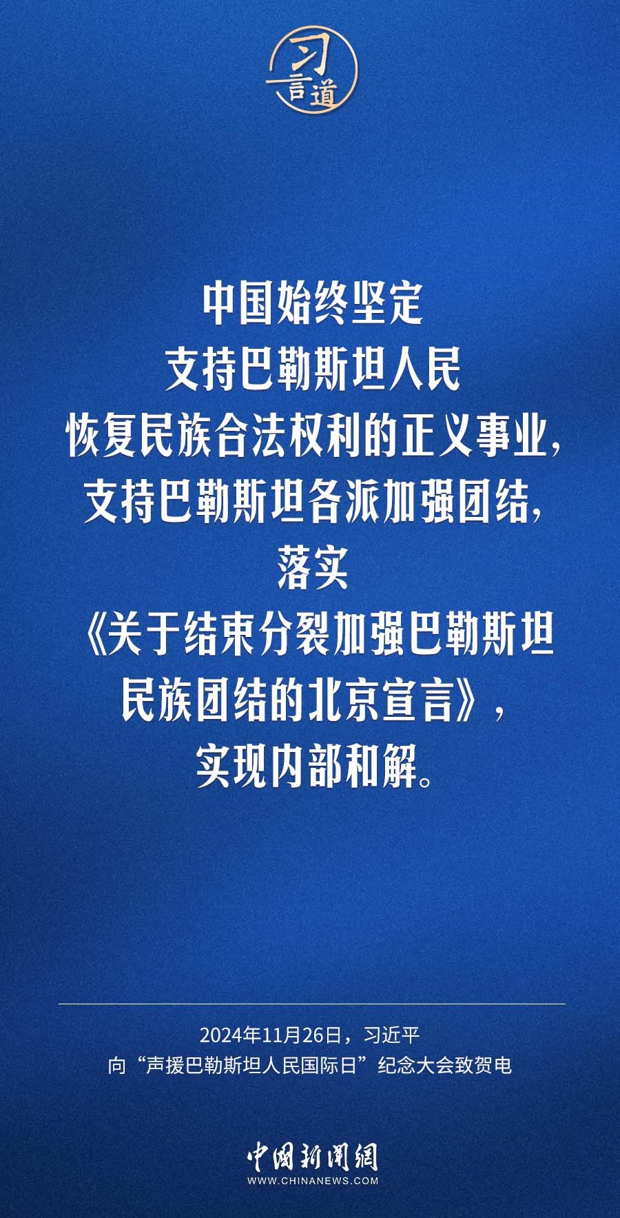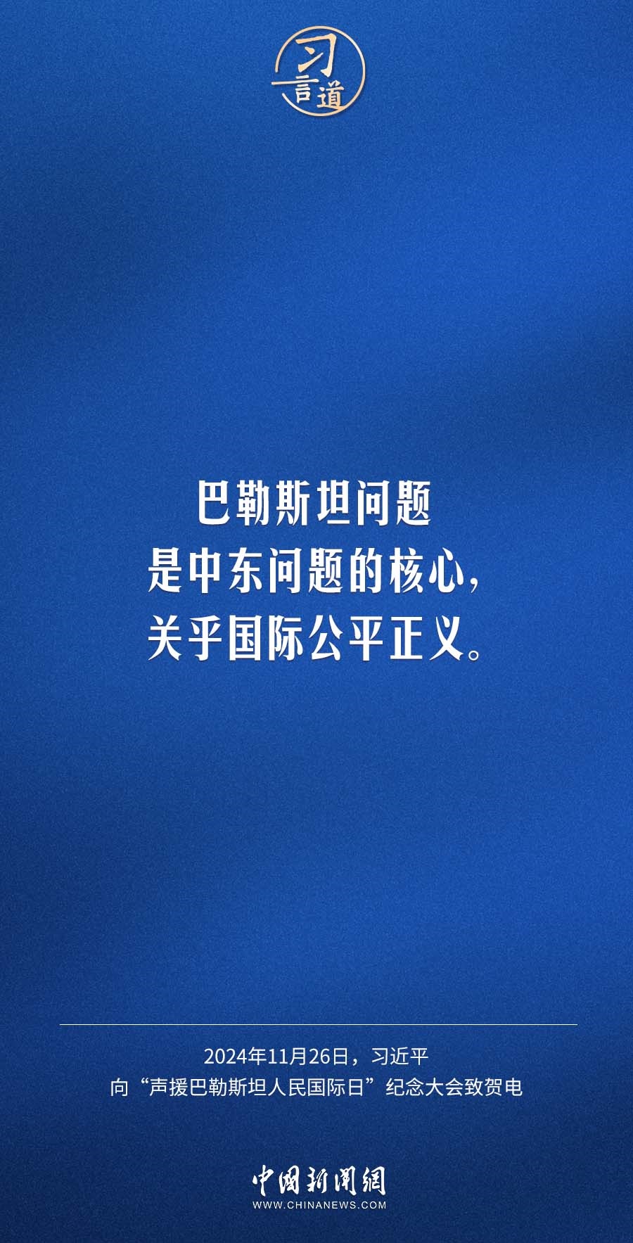 11月26日,聯(lián)合國舉行“聲援巴勒斯坦人民國際日”紀(jì)念大會,國家主席習(xí)近平向大會致賀電。習(xí)近平指出——