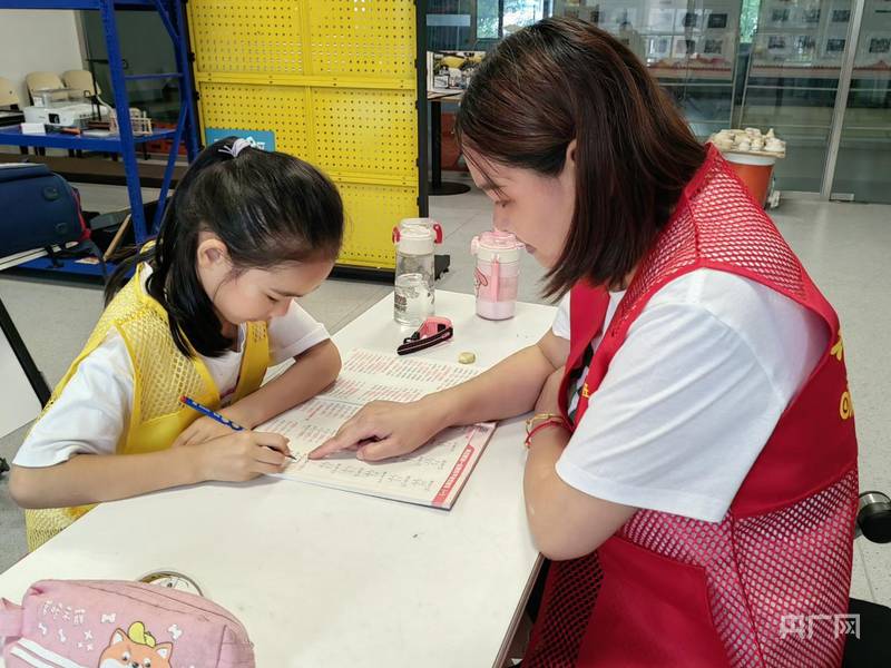 志愿者陳娜正在輔導(dǎo)社區(qū)孩子做作業(yè)(央廣網(wǎng)記者 鮑玉嬋 攝)