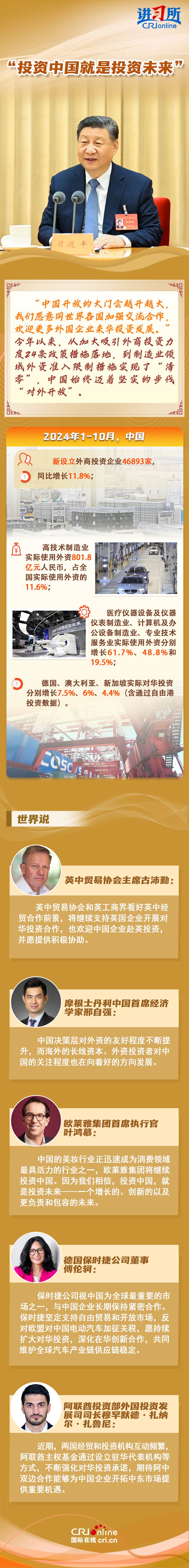 “中國(guó)是實(shí)干家、行動(dòng)派?!苯衲暌詠恚瑥牧?xí)近平主席的歐洲之行到拉美之行,再到四天前在北京會(huì)見主要國(guó)際經(jīng)濟(jì)組織負(fù)責(zé)人,習(xí)近平一直強(qiáng)調(diào),中國(guó)的發(fā)展將給世界帶來巨大機(jī)遇。據(jù)聯(lián)合國(guó)貿(mào)易和發(fā)展會(huì)議不久前發(fā)布的《世界投資報(bào)告2024》中文版顯示,中國(guó)吸引外資的結(jié)構(gòu)不斷優(yōu)化、質(zhì)量不斷提高,多位政商界人士也認(rèn)為中國(guó)是一個(gè)非常有前景的市場(chǎng),投資中國(guó)就是投資未來。