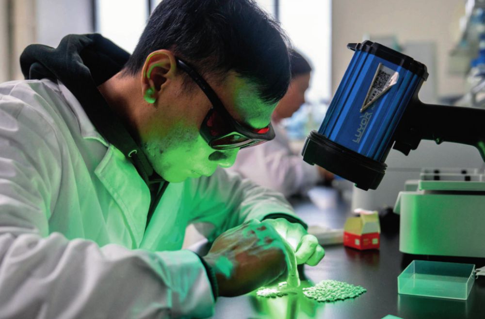 在湖南雜交水稻研究中心,工作人員通過熒光法進行水稻樣本分析(2024年11月25日攝)。陳思汗攝/本刊
