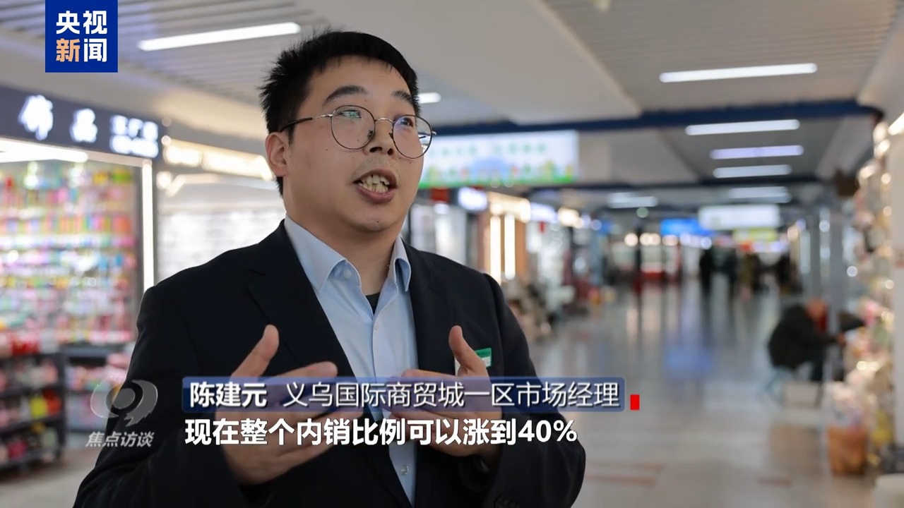義烏國際商貿(mào)城一區(qū)市場(chǎng)經(jīng)理 陳建元:我們有一個(gè)統(tǒng)計(jì),拿我們的飾品行業(yè)來說,經(jīng)過這幾年培育,直播電商的快速發(fā)展,有些經(jīng)營戶轉(zhuǎn)型,現(xiàn)在整個(gè)內(nèi)銷比例可以漲到40%,比例還是有一個(gè)很明顯的提升。