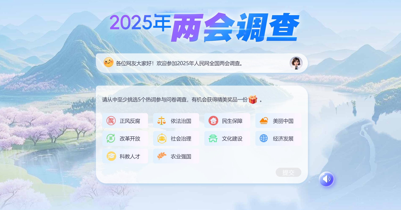 調(diào)查還在火熱進(jìn)行,各界可繼續(xù)通過人民網(wǎng)全媒體通道參與本次調(diào)查。為感謝網(wǎng)友對(duì)人民網(wǎng)2025年全國(guó)兩會(huì)調(diào)查的支持,參與者有機(jī)會(huì)抽取精美獎(jiǎng)品。
