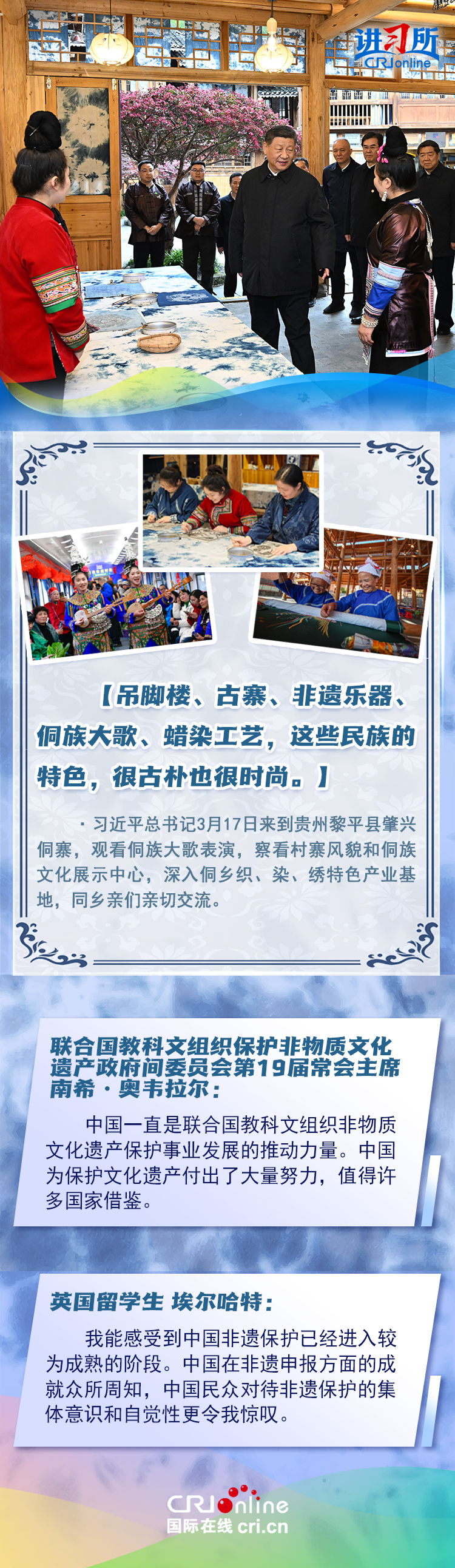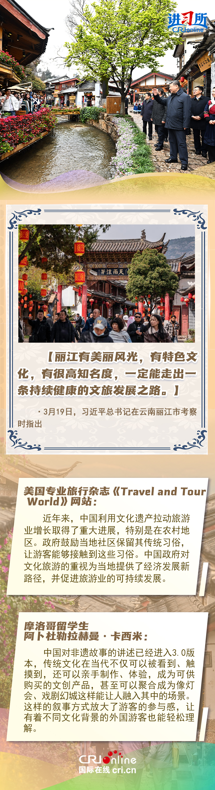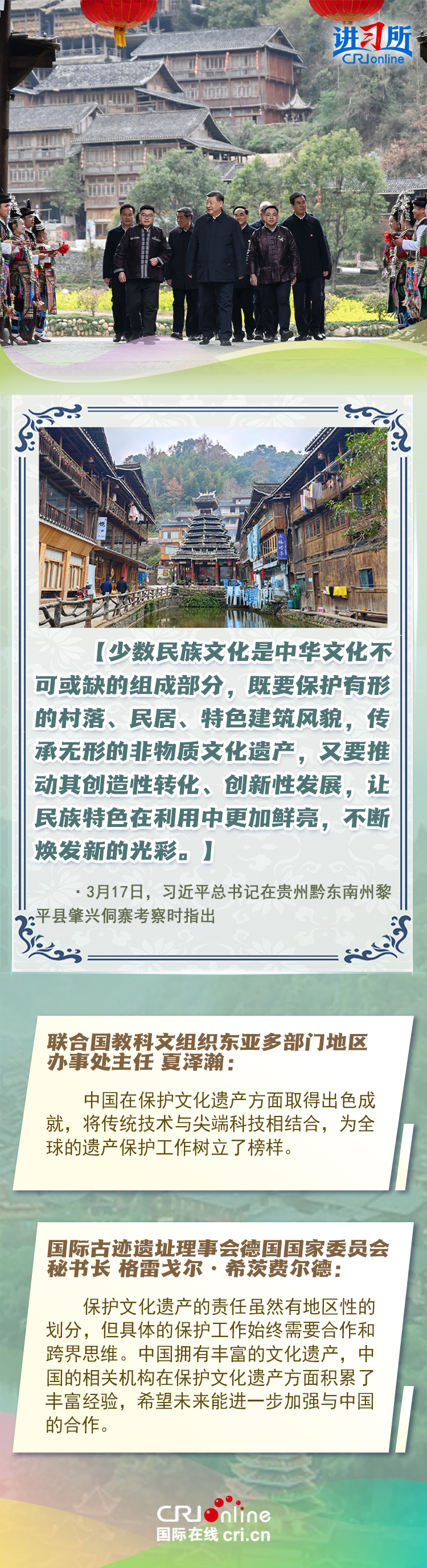 習(xí)近平總書記近日赴貴州、云南考察。他走進(jìn)民族特色村寨、歷史文化古城,心系歷史文化遺產(chǎn)保護(hù)和文旅融合發(fā)展。習(xí)近平特別叮囑當(dāng)?shù)毓賳T和群眾,既要保護(hù)有形的村落、民居、特色建筑風(fēng)貌,傳承無形的非物質(zhì)文化遺產(chǎn),又要推動(dòng)其創(chuàng)造性轉(zhuǎn)化、創(chuàng)新性發(fā)展。