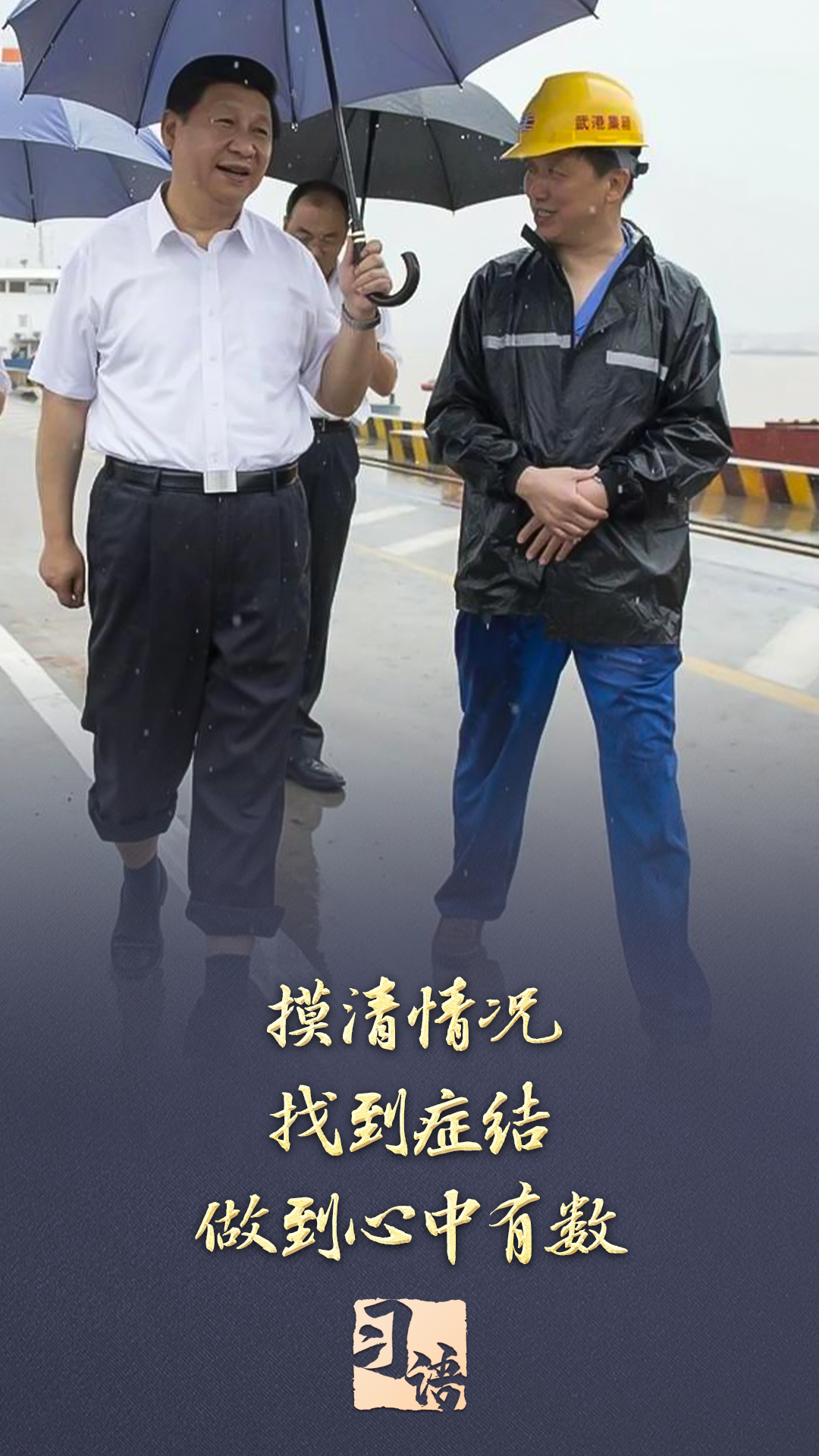 2013年7月,習近平總書記冒雨來到湖北武漢新港陽邏集裝箱港區(qū)考察,他卷起褲腿,打著雨傘,蹚著積水邊走邊看邊問。兩天后,在武漢主持召開部分省市負責人座談會時,習近平總書記強調:“研究、思考、確定全面深化改革的思路和重大舉措,刻舟求劍不行,閉門造車不行,異想天開更不行,必須進行全面深入的調查研究。”