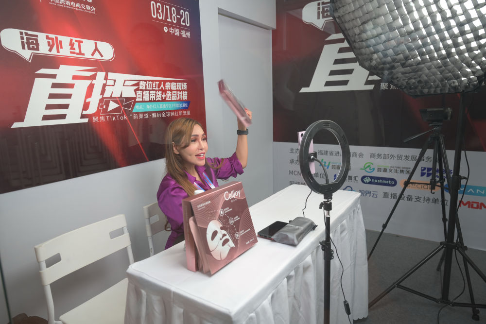 2024年3月18日,一名馬來西亞主播在福建福州舉行的第四屆中國跨境電商交易會(huì)展會(huì)現(xiàn)場直播帶貨。