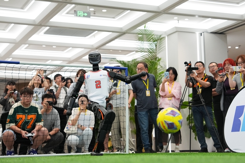 6月17日,加速進(jìn)化Booster T1機(jī)器人在北京經(jīng)開區(qū)的機(jī)器人大世界展示“大力射門”。