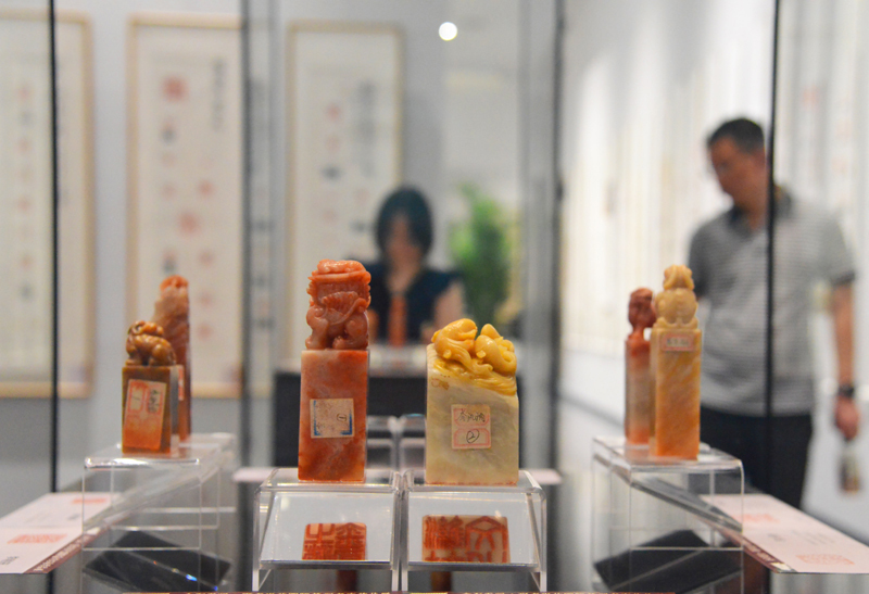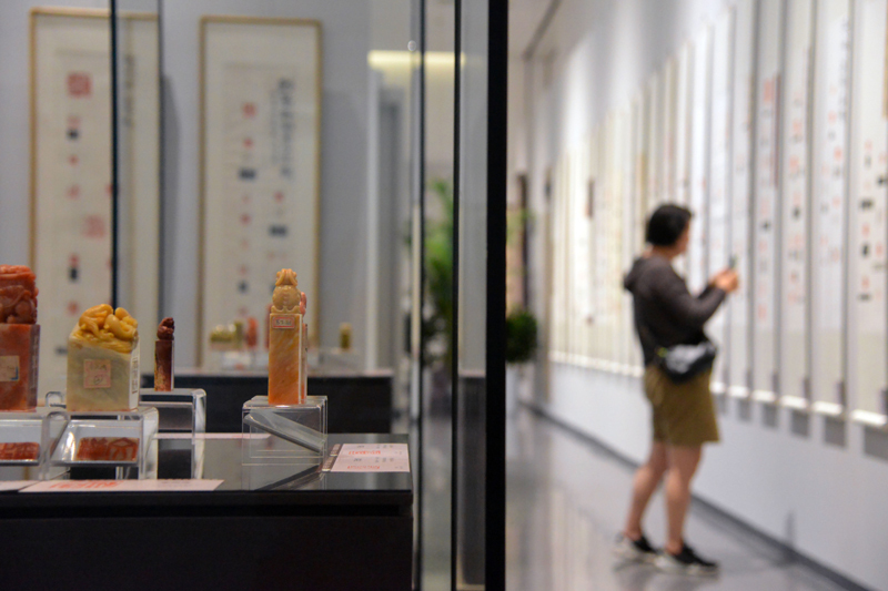 6月21日,觀眾在北京市海淀區(qū)三山五園文化藝術中心參觀薪傳國粹——“萬印樓”新藏當代國際篆刻精品展。