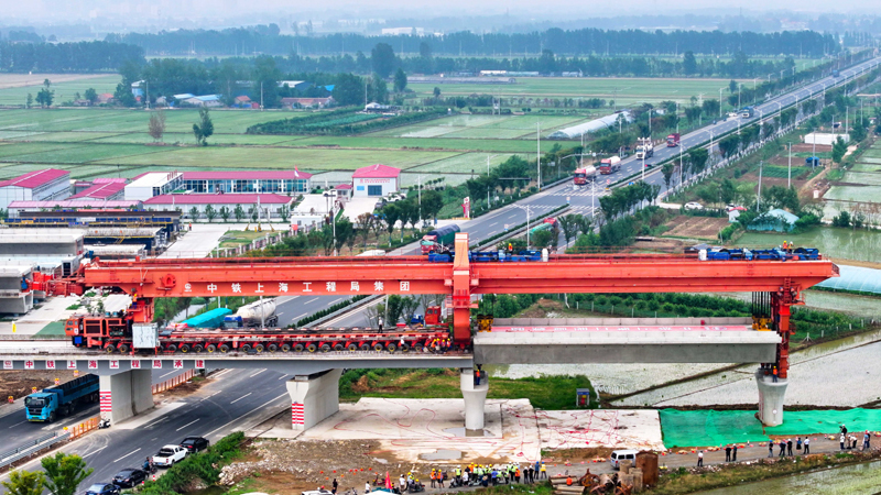 6月21日,在濰宿高鐵郯城沭河特大橋施工現(xiàn)場(chǎng),中鐵上海局工作人員在進(jìn)行箱梁架設(shè)(無(wú)人機(jī)照片)。