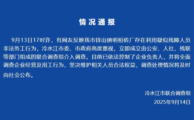 據(jù)“冷水江新聞”微信公眾號(hào)消息,9月13日17時(shí)許,有網(wǎng)友反映湖南冷水江市鐸山鎮(zhèn)明桓磚廠(chǎng)存在利用疑似殘障人員非法務(wù)工行為,冷水江市委、市政府高度重視,立即成立由公安、人社、殘聯(lián)等部門(mén)組成的聯(lián)合調(diào)查組介入調(diào)查。目前已依法控制了企業(yè)負(fù)責(zé)人,并將全面調(diào)查企業(yè)經(jīng)營(yíng)及用工行為,堅(jiān)決維護(hù)相關(guān)人員合法權(quán)益,調(diào)查處理情況將及時(shí)向社會(huì)公布。
