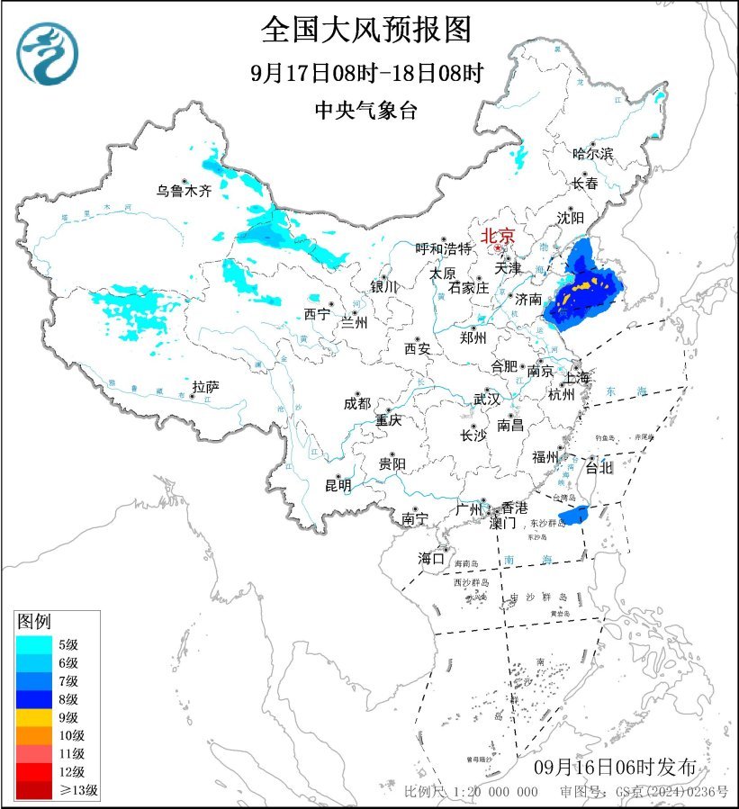 預(yù)計(jì),9月16日8時(shí)至17日8時(shí),新疆東部及南疆盆地、甘肅河西、青海北部、內(nèi)蒙古西部和中東部、東北地區(qū)西部、山東半島等地部分地區(qū)有5級(jí)、陣風(fēng)7級(jí)的大風(fēng),其中,內(nèi)蒙古東北部的部分地區(qū)風(fēng)力可達(dá)7級(jí)、陣風(fēng)9級(jí);渤海、渤海海峽、黃海北部和中西部海域?qū)⒂?~8級(jí)、陣風(fēng)9級(jí)的大風(fēng),其中黃海中西部的部分海域風(fēng)力可達(dá)9~10級(jí)、陣風(fēng)11級(jí)。