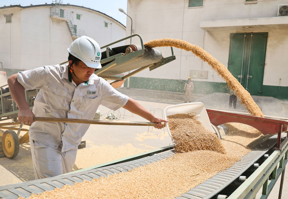 在江蘇連云港市連云區(qū)的中央儲備糧連云港直屬庫糧食收購作業(yè)區(qū),工作人員用傳輸機(jī)傳送小麥入庫(2025年6月18日攝)。新華社發(fā)(王健民攝)