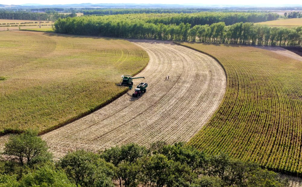 秋高云淡,黑龍江省七臺河市勃利縣的玉米地里一派繁忙景象。大型收割機(jī)往來穿梭,飽滿的玉米棒被自動精準(zhǔn)收入機(jī)身。脫粒后,金燦燦的玉米粒源源不斷涌入隨行的運(yùn)糧車。