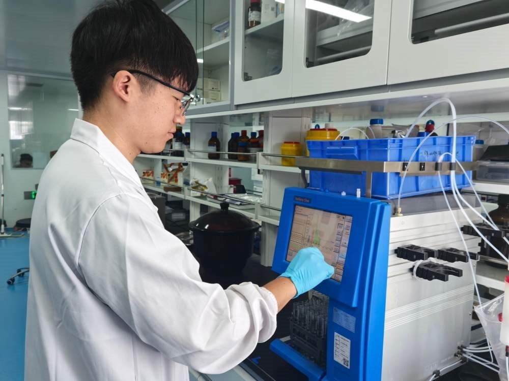 合源生物科技(天津)有限公司工作人員在生產(chǎn)基地的檢測(cè)室進(jìn)行檢測(cè)。新華社記者 趙子碩 攝
