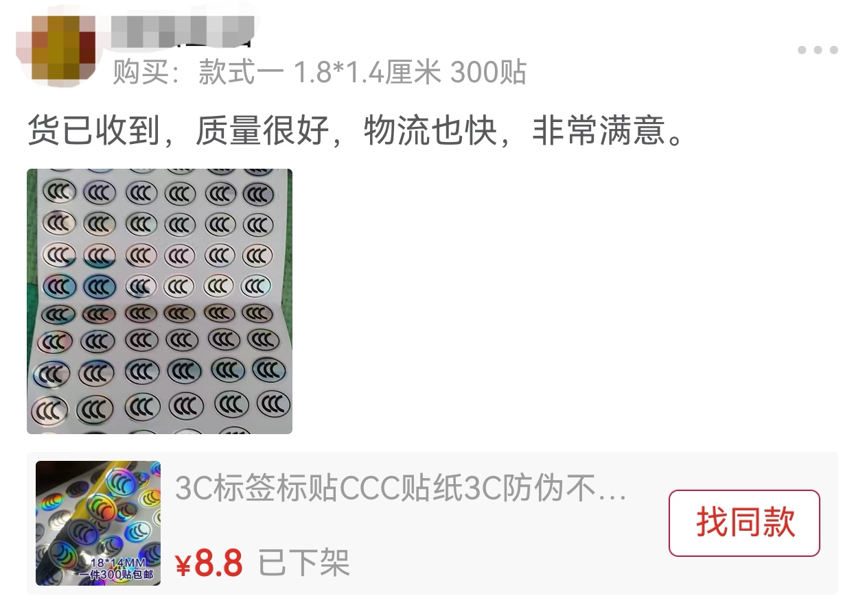 不過,這卻變成了一些人眼中的“商機(jī)”。中國新聞網(wǎng)《民生調(diào)查局》記者在部分電商平臺(tái)發(fā)現(xiàn),“3C貼紙”目前仍有售賣,甚至可以隨意定制。