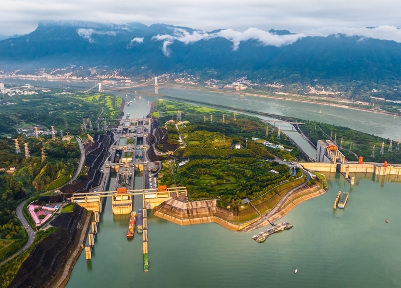 7月1日,在湖北宜昌,船舶有序通過三峽雙線五級船閘和升船機(無人機照片)。