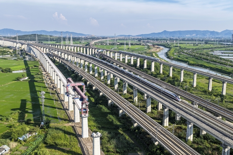 這是中鐵四局巢馬城際鐵路架梁施工現(xiàn)場(chǎng)(7月1日,無(wú)人機(jī)照片)。