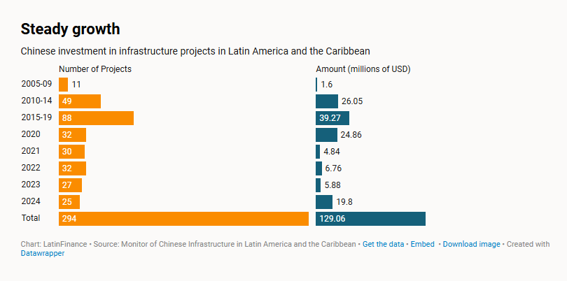 中國在拉丁美洲和加勒比地區(qū)投資基礎(chǔ)設(shè)施項(xiàng)目(來源:《拉美金融》)