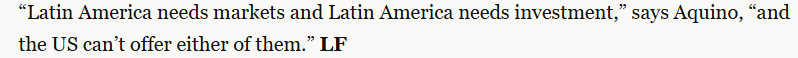 文章指出,并非所有人都對拉美與中國之間的合作感到滿意。華盛頓尤其擔(dān)心。不過,許多人認(rèn)為華盛頓影響拉丁美洲的能力有限。文章援引利馬國立圣馬科斯大學(xué)的亞洲經(jīng)濟(jì)專家卡洛斯·阿基諾的話指出,“拉丁美洲需要市場和投資,但美國無法提供其中任何一項(xiàng)”。