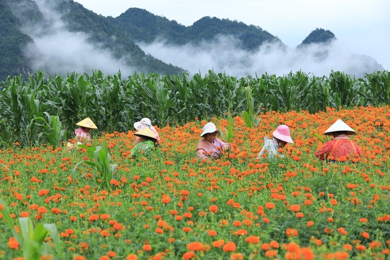 7月21日,云南騰沖市固?hào)|鎮(zhèn)農(nóng)民在鳳凰山采收萬壽菊。