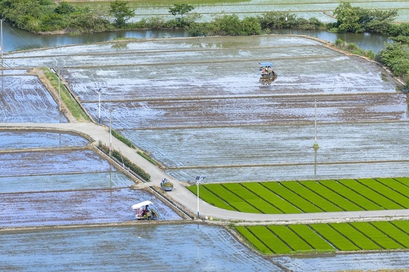 7月21日,浙江省余姚市黃家埠鎮(zhèn)上塘村農(nóng)民在田間駕駛插秧機(jī)插種晚稻(無人機(jī)照片)。
