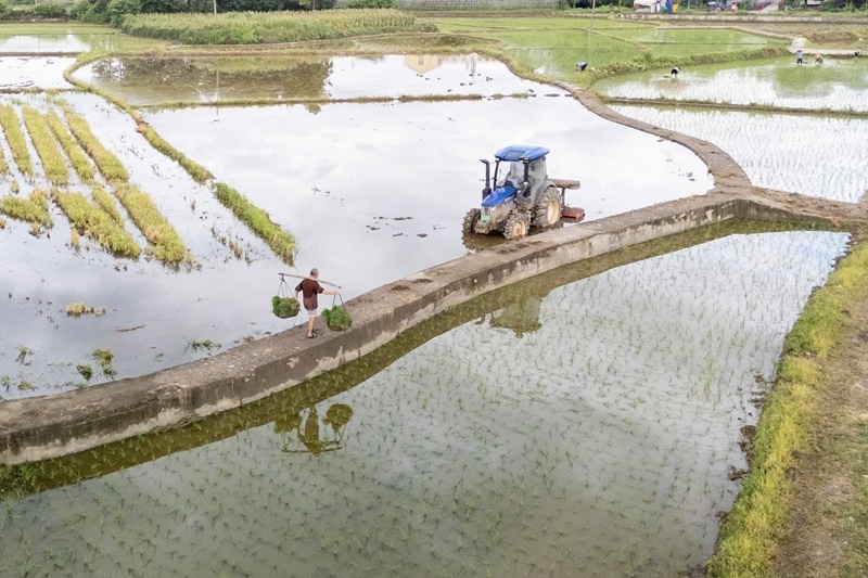 7月21日,農(nóng)民在湖南省婁底市婁星區(qū)杉山鎮(zhèn)杉山村的田間挑運(yùn)晚稻秧苗(無人機(jī)照片)。