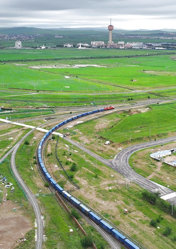 7月24日,一列滿載貨物的中歐班列從中國鐵路哈爾濱局集團(tuán)有限公司滿洲里站駛出國門(無人機(jī)照片)。