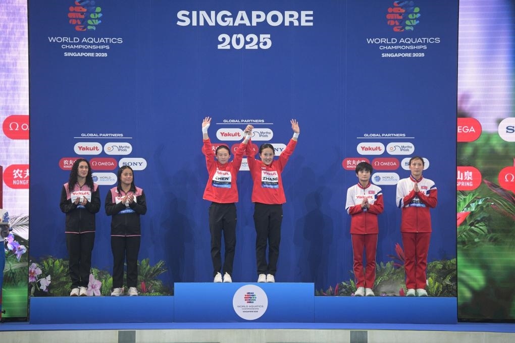 7月28日,陳芋汐(左三)/掌敏潔(右三)在頒獎儀式上。新華社發(fā)(鄧智煒攝)