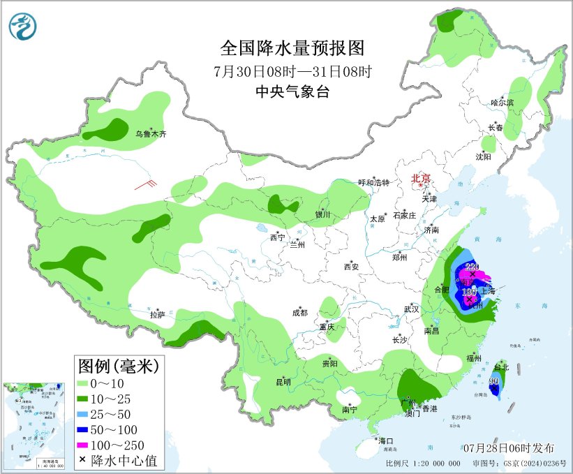 7月29日08時至30日08時,內(nèi)蒙古東北部、黑龍江北部、吉林中部、遼寧北部、江蘇南部、上海、浙江中東部、臺灣島中南部、廣東南部等地的部分地區(qū)有大到暴雨,其中,浙江中東部等地的部分地區(qū)有大暴雨(100~200毫米)。內(nèi)蒙古東部有4~5級風(fēng)。東海大部海域、臺灣以東洋面偏南海域、巴士海峽將有7~8級、陣風(fēng)9級的西南風(fēng),臺風(fēng)中心經(jīng)過的附近海域風(fēng)力可達(dá)9~10級、陣風(fēng)11~12級。
