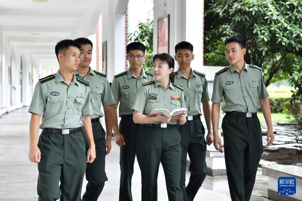 國防科技大學軍政基礎(chǔ)教育學院教授傅婉娟(右三)與學員們一起討論教材內(nèi)容 (7月22日攝)。新華社發(fā)(王驍 攝)
