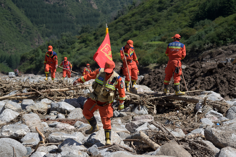 8月11日,在榆中縣馬坡鄉(xiāng)陽(yáng)屲山村,蘭州市消防救援支隊(duì)救援人員開(kāi)展清理搜尋工作。