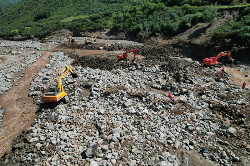 8月11日,在榆中縣馬坡鄉(xiāng)陽(yáng)屲山村,中國(guó)安能救援隊(duì)使用挖掘機(jī)疏通清理山洪沖下的石頭。