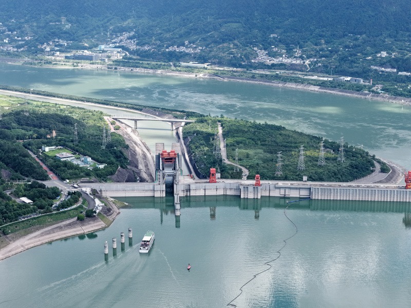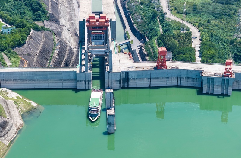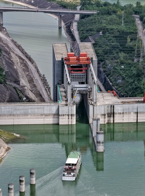 8月16日,在湖北省宜昌市,游輪滿載游客通過(guò)三峽升船機(jī)(無(wú)人機(jī)照片)。