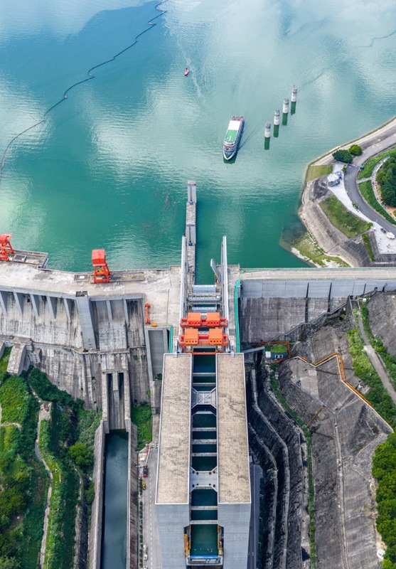 8月16日,在湖北省宜昌市,下行游船長(zhǎng)江三峽5號(hào)通過(guò)三峽升船機(jī)(無(wú)人機(jī)照片)。