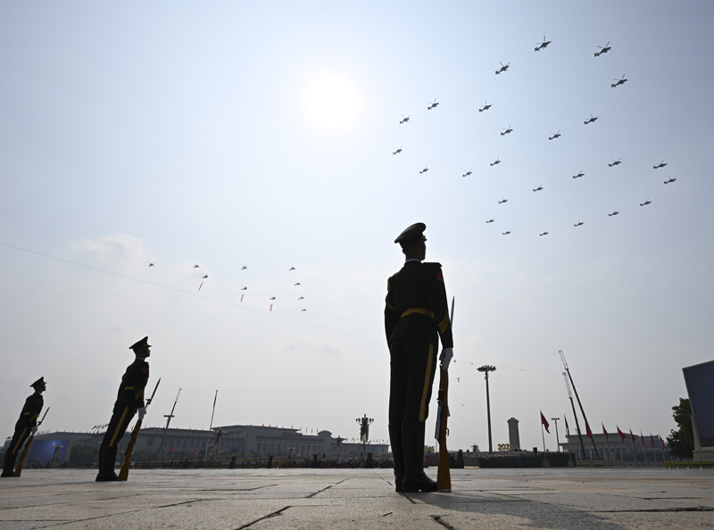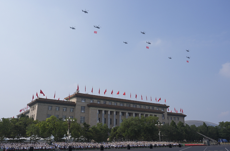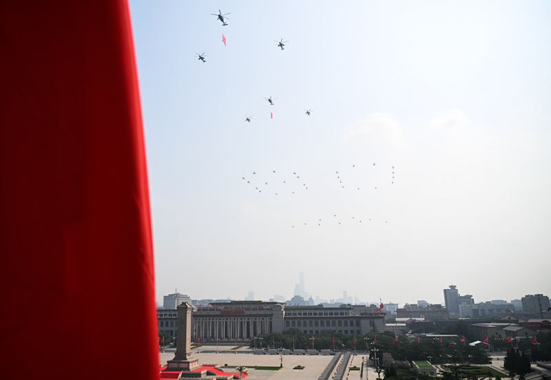 9月3日,紀念中國人民抗日戰(zhàn)爭暨世界反法西斯戰(zhàn)爭勝利80周年大會在北京隆重舉行。這是空中護旗梯隊飛過天安門廣場上空,26架直升機匯成巨大的“80”字樣。