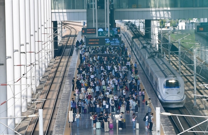 10月8日,旅客在江蘇無錫火車站站臺乘車。