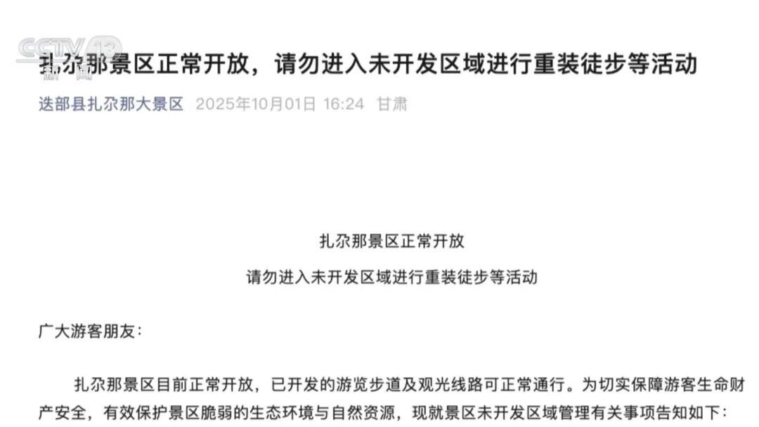 假期第一天,扎尕那景區(qū)宣布,嚴(yán)禁任何組織或個人未經(jīng)批準(zhǔn)擅自進(jìn)入其未開發(fā)區(qū)域開展重裝徒步等活動。