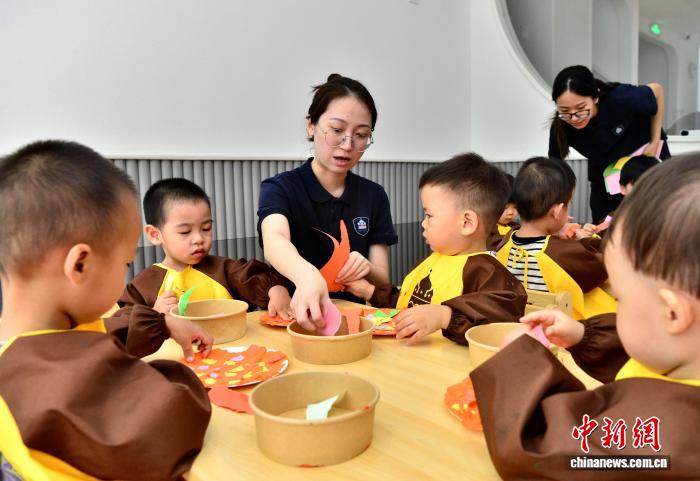 7月29日,福州新星托育園東街園老師指導(dǎo)小朋友進(jìn)行藝術(shù)創(chuàng)想,制作美味的“披薩”。近年來,當(dāng)?shù)胤e極推動公辦幼兒園和社會力量興辦發(fā)展托育教育服務(wù),以解決民眾“帶娃難”的問題?!≈行律缬浾?張斌 攝