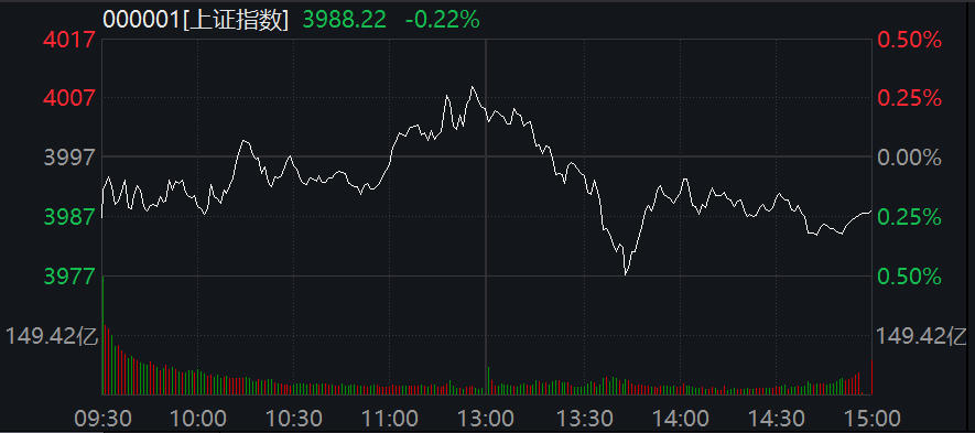截至收盤,滬指跌0.22%,報3988.22點;深成指跌0.44%,報13430.1點;創(chuàng)業(yè)板指跌0.15%,報3229.58點。兩市合計成交21479億元,較上個交易日縮量約2000億元。