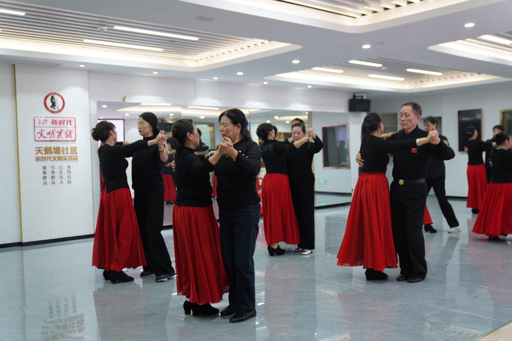 老年大學(xué)學(xué)員在天鵝塘社區(qū)參加交誼舞課程。新華社記者戴明軒攝