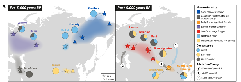 科研團(tuán)隊(duì)這項(xiàng)研究首先發(fā)現(xiàn)中國(guó)五千年前存在獨(dú)特的家犬古老血統(tǒng),隨后數(shù)千年中國(guó)古代家犬逐漸出現(xiàn)來自西伯利亞和西方的古代家犬血統(tǒng)滲入,同時(shí)來自中國(guó)的古老東亞祖份也廣泛擴(kuò)散到了歐亞草原多處。團(tuán)隊(duì)通過與人類古基因組數(shù)據(jù)和證據(jù)對(duì)照,發(fā)現(xiàn)家犬?dāng)?shù)次滲入事件與人類的多次遷徙高度重合。如東西伯利亞早全新世家犬譜系與同時(shí)期人類譜系的分布高度吻合。此外,歐亞草原地區(qū)家犬中西方祖分的增加也與古人類遷移歷史相吻合,具體而言我們發(fā)現(xiàn)歐亞草原前期的新石器時(shí)代家犬和東歐狩獵采集人群相關(guān),后期的青銅時(shí)代家犬和伊朗農(nóng)耕人群和高加索狩獵采集者相關(guān)。