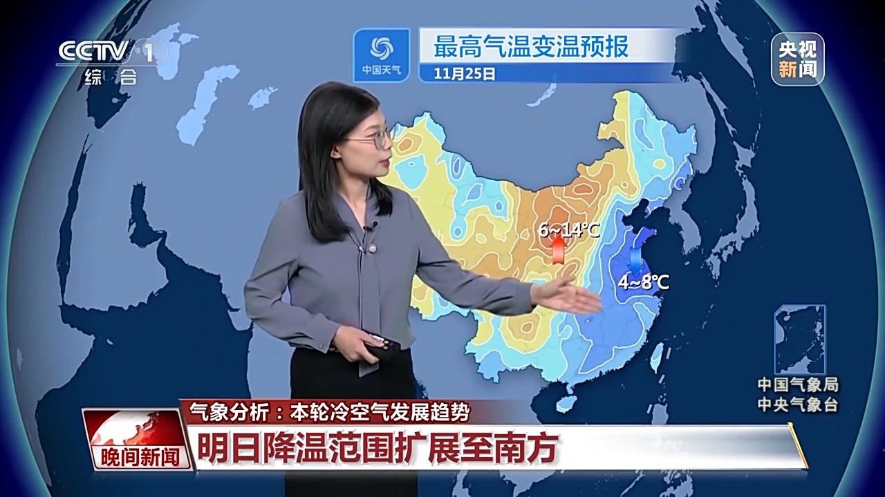 25日冷空氣將快速東移南下,降溫的范圍也會向南擴(kuò)展到南方大部地區(qū),尤其是在山東、江蘇、安徽一帶,最高氣溫單日降幅可以達(dá)到4~8度。最高氣溫會降到常年正常水平附近,10度線會南壓到黃淮,20度線會退至華南一帶。