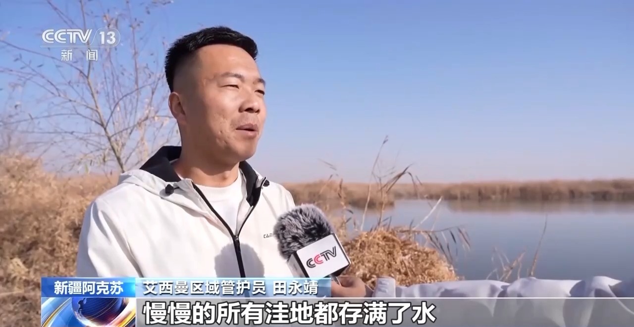 艾西曼區(qū)域管護(hù)員 田永靖:再生水過來之后,慢慢所有洼地都存滿了水,變成了現(xiàn)在所看到的濕地,這一大片的蘆葦現(xiàn)在長勢(shì)都特別不錯(cuò)。