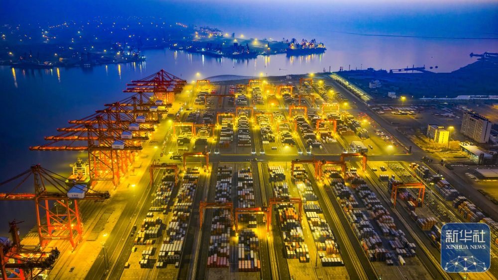 ↑ 12月15日,在山東港口青島港,貨輪在裝卸外貿(mào)集裝箱(無人機照片)。新華社發(fā)(俞方平攝)
