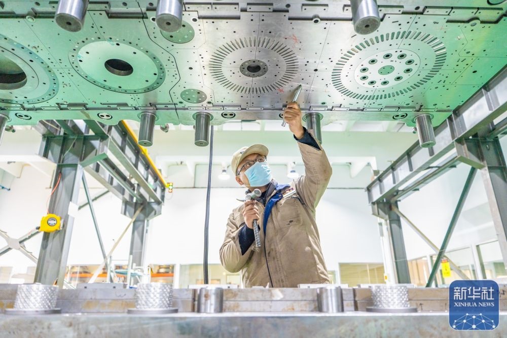 ↑ 12月15日,中鐵科工集團武漢江夏制造基地技術(shù)工人對盾構(gòu)機配件進行裝配作業(yè)。新華社發(fā)(趙軍攝)