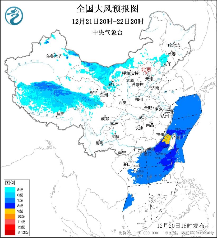 12月21日20時(shí)至22日20時(shí),內(nèi)蒙古中西部、東北地區(qū)南部、華北北部、新疆北疆東部、西藏北部、青海中南部等地有5~6級風(fēng),陣風(fēng)7~9級;東海大部海域、臺(tái)灣海峽、臺(tái)灣以東洋面、巴士海峽、南海北部和中部海域?qū)⒂?~8級、陣風(fēng)9~10級的大風(fēng),其中臺(tái)灣海峽的風(fēng)力可達(dá)9級、陣風(fēng)10~11級。