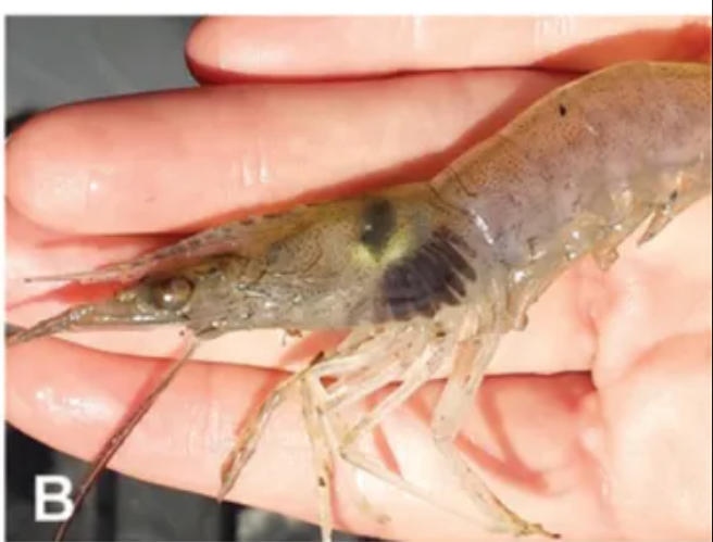 在水質(zhì)差、溶氧低的環(huán)境中,受傷的蝦容易感染細(xì)菌或真菌,導(dǎo)致其鰓組織壞死并出現(xiàn)黑色沉積。