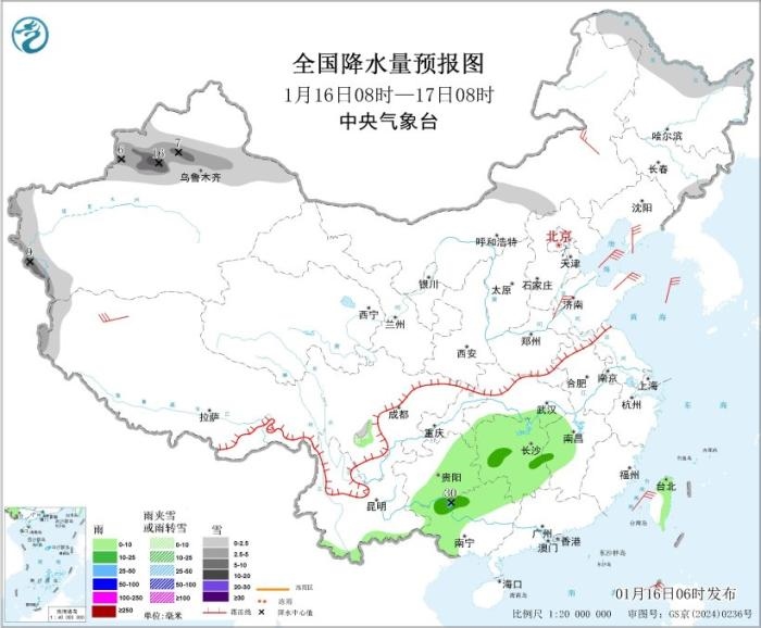 1月16日08時至17日08時,新疆沿天山地區(qū)及南疆西部山區(qū),黑龍江北部、吉林東部、西藏西部等地部分地區(qū)有小到中雪,其中,新疆沿天山西部地區(qū)和伊犁河谷等地部分地區(qū)有大到暴雪(10~16毫米);江南中西部、貴州東部和南部、廣西西部和北部、云南南部、臺灣島東部等地部分地區(qū)有小到中雨,廣西西北部局地有大雨(25~30毫米)。內(nèi)蒙古中東部、華北北部、黃淮中東部、遼寧南部、西藏中西部等地部分地區(qū)有4~6級風;渤海、渤海海峽、黃海北部和中部有5~7級風、陣風8級(見圖1)。
