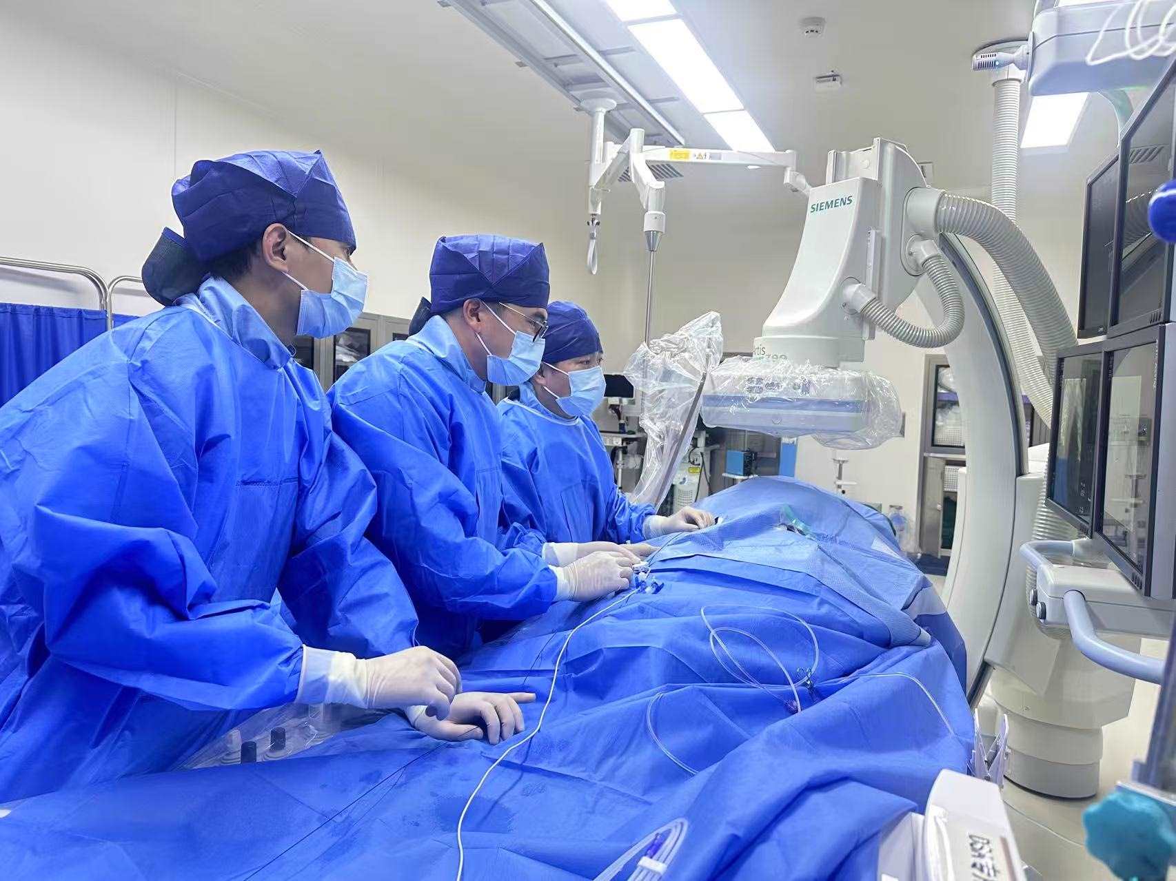 中山大學(xué)附屬第一醫(yī)院血管外科常光其教授、李梓倫教授團(tuán)隊(duì)順利開(kāi)展中國(guó)大陸首例EKOS超聲波輔助溶栓系統(tǒng)治療肺動(dòng)脈栓塞。新華網(wǎng)發(fā)(受訪者供圖)