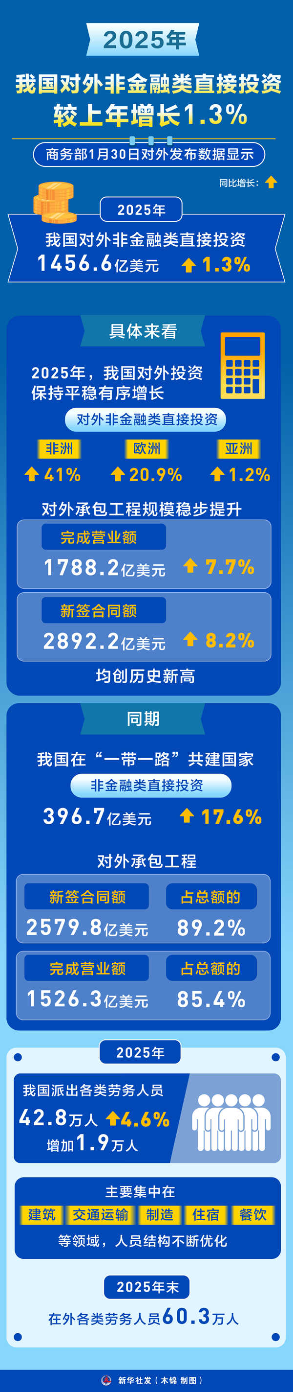 具體來看,2025年,我國對外投資保持平穩(wěn)有序增長,對非洲、歐洲、亞洲非金融類直接投資分別增長41%、20.9%和1.2%;對外承包工程規(guī)模穩(wěn)步提升,完成營業(yè)額1788.2億美元,較上年增長7.7%,新簽合同額2892.2億美元,較上年增長8.2%,均創(chuàng)歷史新高。